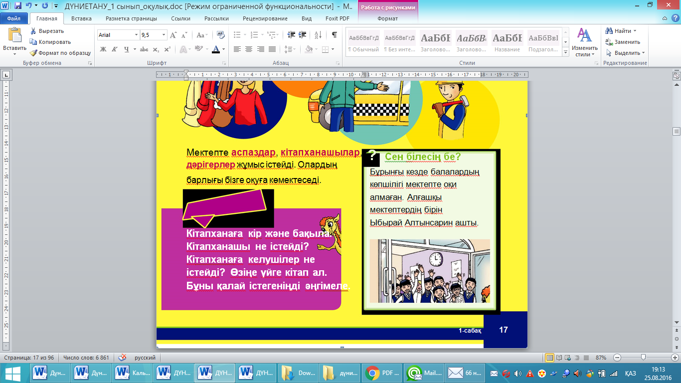 Кеспе әріптер, Ы.Алтынсариннің портреті, Ы.Алтынсариннің «Кел, балалар, оқылық!» өлеңі, асханадағы аспаз, кітапханадағы кітапханашы, дәрігер бөлмесіндегі дәрігер, сыныптағы мұғалім бейнеленген сюжетті суреттер. Володин Б.Ф. Дүниежүзілік кітапхана тарихы: Mонография. – 2-ші басылым, қосымша. – СПб.: Профессия, 2004. - 432 с. |