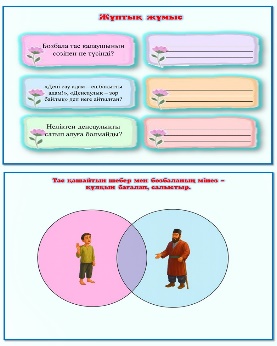 1 топ оқушылары сөздер мен кейіпкерлердің әс-әрекетін, сипаттамаларын салыстырады. 2 топ оқушылары сөйлемді жалғастырып, жағдаятты шешеді. 3 топ оқушылары ертегіні сахналайды(қосымша кейіпкер қосуға болады) |
