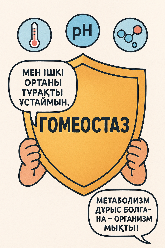 Организмді қамқорлықпен ұстап тұрған қалқан — "Гомеостаз". Артында температура, pH, су-тұз тепе-теңдігі белгілері.