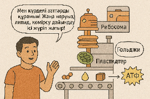 – Жасуша: «Маған заттар келді! Енді оларды өңдеп, пайдалысын қалдырып, қажетсізін шығаруым керек.»