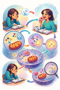 "Mitochondria breaking down glucose into small molecules, energy release animation, educational" |