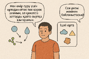 Адам бейнесі және оның айналасында оттек, су, қорек молекулалары → ішкі орта → соңғы өнімдер сыртқа шығуы.