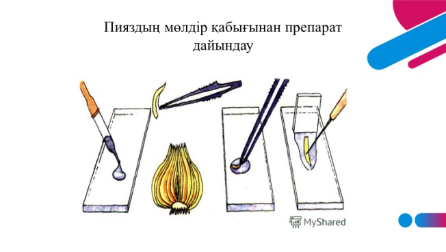 Микроскоп, Петри ыдысы, заттық шыны, жабын шыны, қысқыш, тамызғы, пияз өсімдігі, йод |