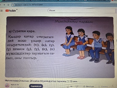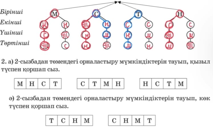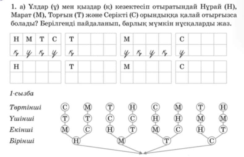 Өткенді пысықтау 6-тапсырма Кесте бойынша теңдеу құрып, оны шеш. Үлгі: 1) 120+х=460 Х=460-120 Х=340 120+340=460 460=460 Жаңа тақырып 1-тапсырма а) Ұлдар (ұ) мен қыздар (қ) кезектесіп отыратындай Нұрай (Н), Марат (М), Торғын (Т) және Серікті (С) орындыққа қалай отырғызса болады? Берілгенді пайдаланып, барлық мүмкін нұсқаларды жаз.