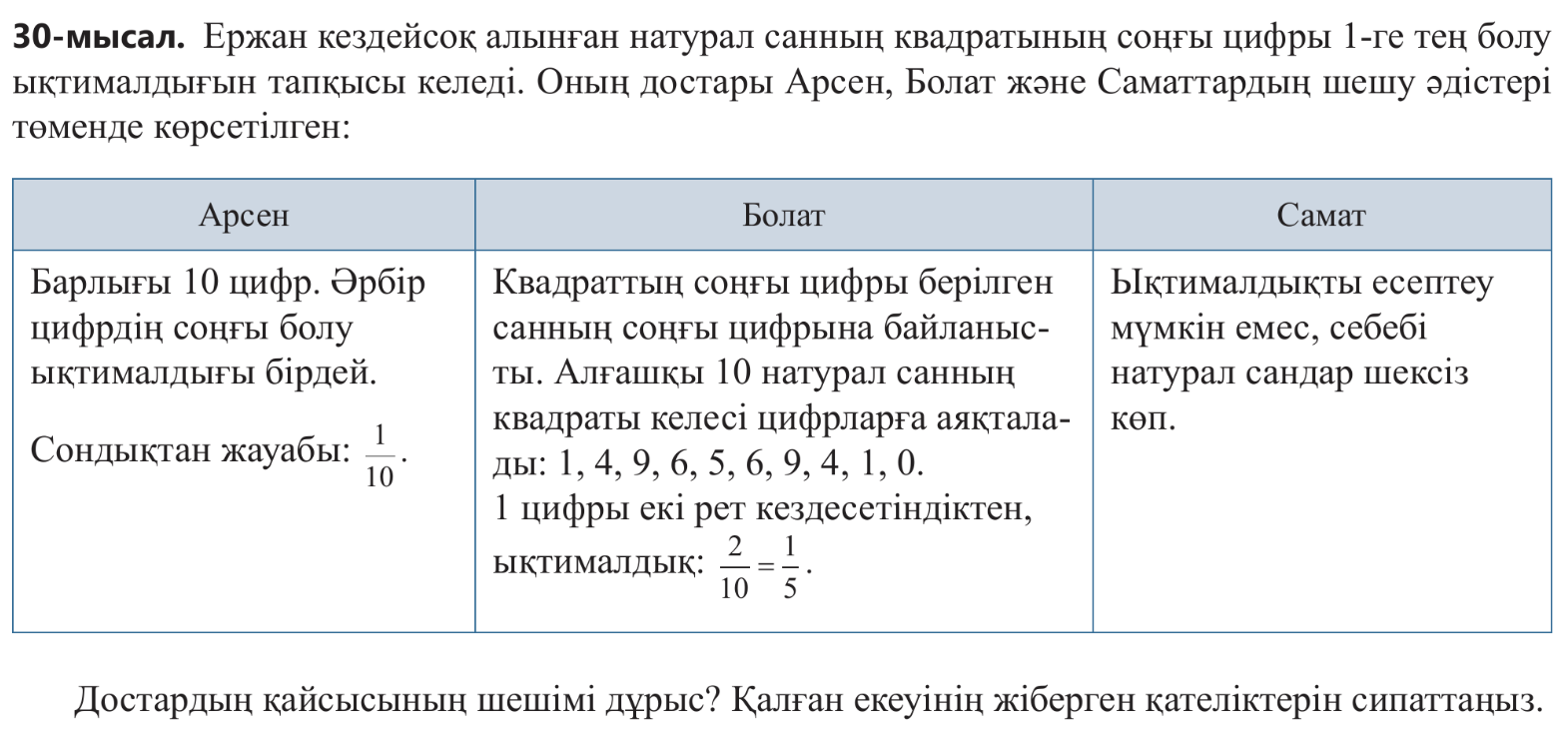 Ержан кездейсоқ алынған натурал санның квадратының соңғы цифры 1-ге тең болуы ықтималдығын тапқысы келеді. Оның достары Арсен, Болат және Саматтың шешу әдісі төменде көрсетілген: