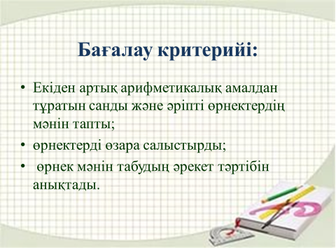Оқушылар игереді: Құрамында барлық 4 арифметикалық амалдары болатын, жақшалы жəне жақшасыз өрнектерді дауыстап оқу. Пəндік лексика жəне терминология: Амалдар реті, жақшалар, өрнек. |