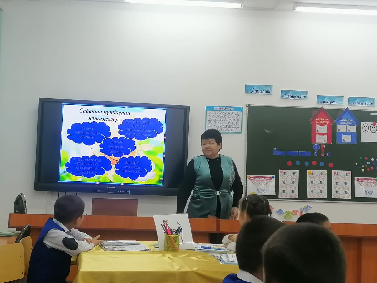 Психологиялық ахуал қалыптастыру «Нейрожаттығу» «Сен қандайсың?» Алдияр-ашық Абылайхан-ақылды т.с.с Суреттер беріледі (қобыз және домбыра)сол арқылы екі топқа бөлінеді «Сиқырлы қорап» әдісі Сабақ мақсатын хабарлау Өткенді пысықтау Топпен жұмыс «Кір жаятын жіп» әдісі Анамыз киім жуды. Аспан шайдай ашық еді . Лезде аспанды қара бұлт торлап жаңбыр жауа бастады . Анамызға киімдерді жинауға көмектесеміз бе? .Әр топқа 3 сұрақтан беріледі -Дыбыс дегеніміз не? -Әріп дегеніміз не? -Дыбыстар нешеге бөлінеді? -Буынға дауысты дыбыстың қандай қатысы бар? -Сөйлем неден құралады, сөйлемдегі сөздер қалай жазылады? -Сөйлем қалай жазылады? -Сөйлем соңына не қойылады? -Кім ?Кімдер? сұрағына жауап беретін сөздер ? -Не? Нелер? Сұрағына жауап беретін сөздер? Жеке жұмыс Әріптерді қайталау.Сигнал карточкалар арқылы дауысты дауыссыз екенін көрсетеді Оқылым «Баскетбол» әдісі Жұптық жұмыс Түлкі шүмек күрек дүрбі Күлкі түбек жүрек Үміт құн – күн құндыз – күндіз құл – күл тұр – түр тұз – түз тұс – түс сұр – сүр ұру – үру Жұптық жұмыс «Бургер» әдісі Дыбыстық жинақтау дағдысын дамыту жұмысы. А)Оқулықтың 73-бетіндегі 1-тапсырма бойынша әр қатардағы артық әріпті табу. Бірінші қатарда «і», екінші қатарда «й» әріптері неліктен артық екенін дәлелдейді. Бір-бірінің қатесін түзейді. Ә) артық суретті тап неліктен артық екенін дәлелдейді. 2.Топтық жұмыс Сызбаға сәйкес «Білімді мыңды жығар» мақалын құрайды. Бір-бірінің қатесін түзейді. Жеке оқушымен жұмыс Сурет пен әріпті сәйкестендіру Жеке оқушымен жұмыс Артығын тап ойыны Жазылым. 1. Жазу дәптерімен жұмысты ұйымдастыру. Гүл күлтелерін дыбысына сәйкес бояу. Ұяшықтағы әріптер қатарынан сөздерді тауып оқу. Жеке оқушымен жұмыс Әріп жазу Сергіту «Ауа райы» «Аяқ пен қол» жаттығуы