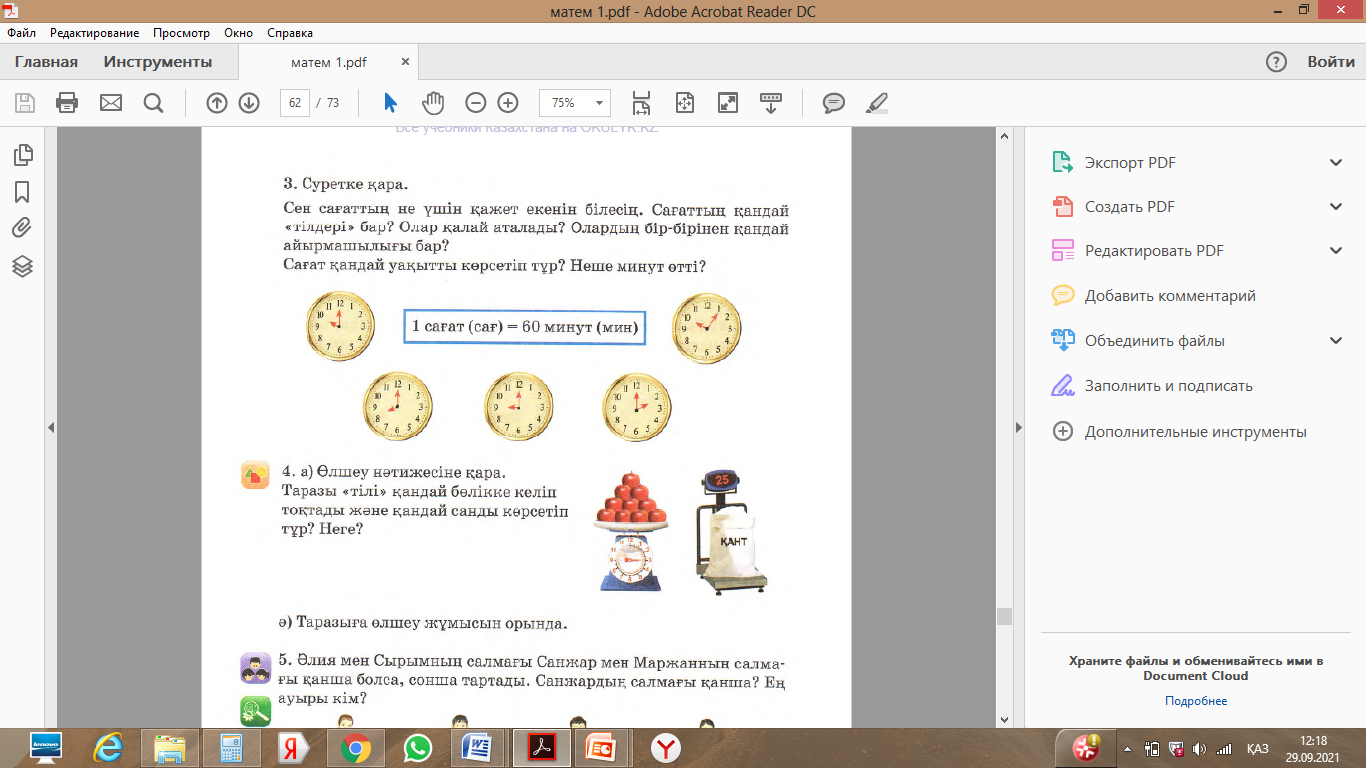 «Уақыт» Жұмбақ жасыру арқылы жаңа сабаққа ену Үш тілі бар, Тықылдаған үні бар.(Сағат) Үш тілділік: Сағат-часы-watch Жұқа тақтай бөлшегі, Ұзындықтың өлшемі.(Сызғыш) Үш тілділік: сызғыш – линейка – ruler Артық кемді теңестірер, Артық салмақ жемес бірер.(Таразы) Үш тілділік: таразы – весы – scales -Берілген суреттерге қара. Бұл қандай құралдар? Атаңдар. |