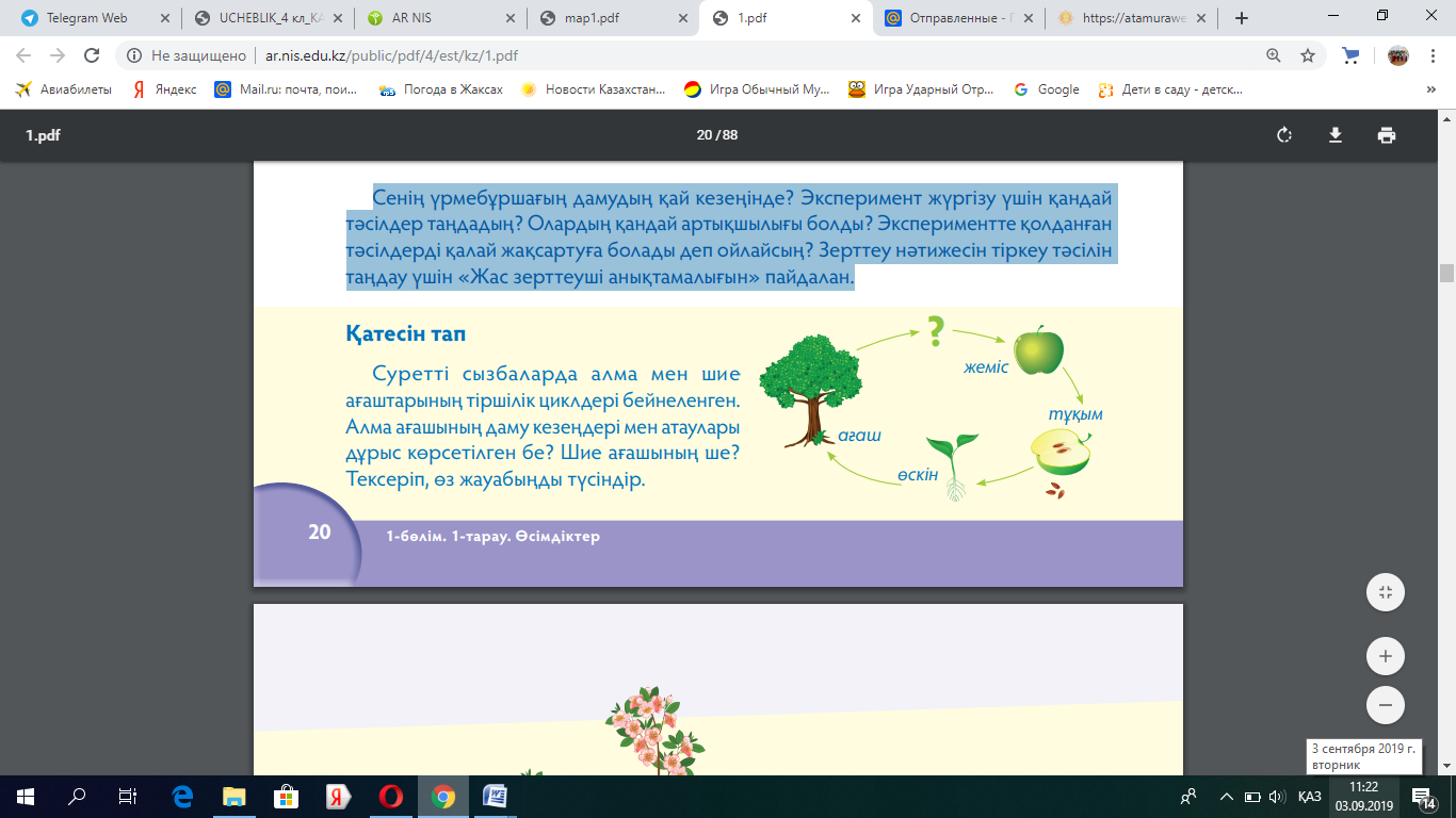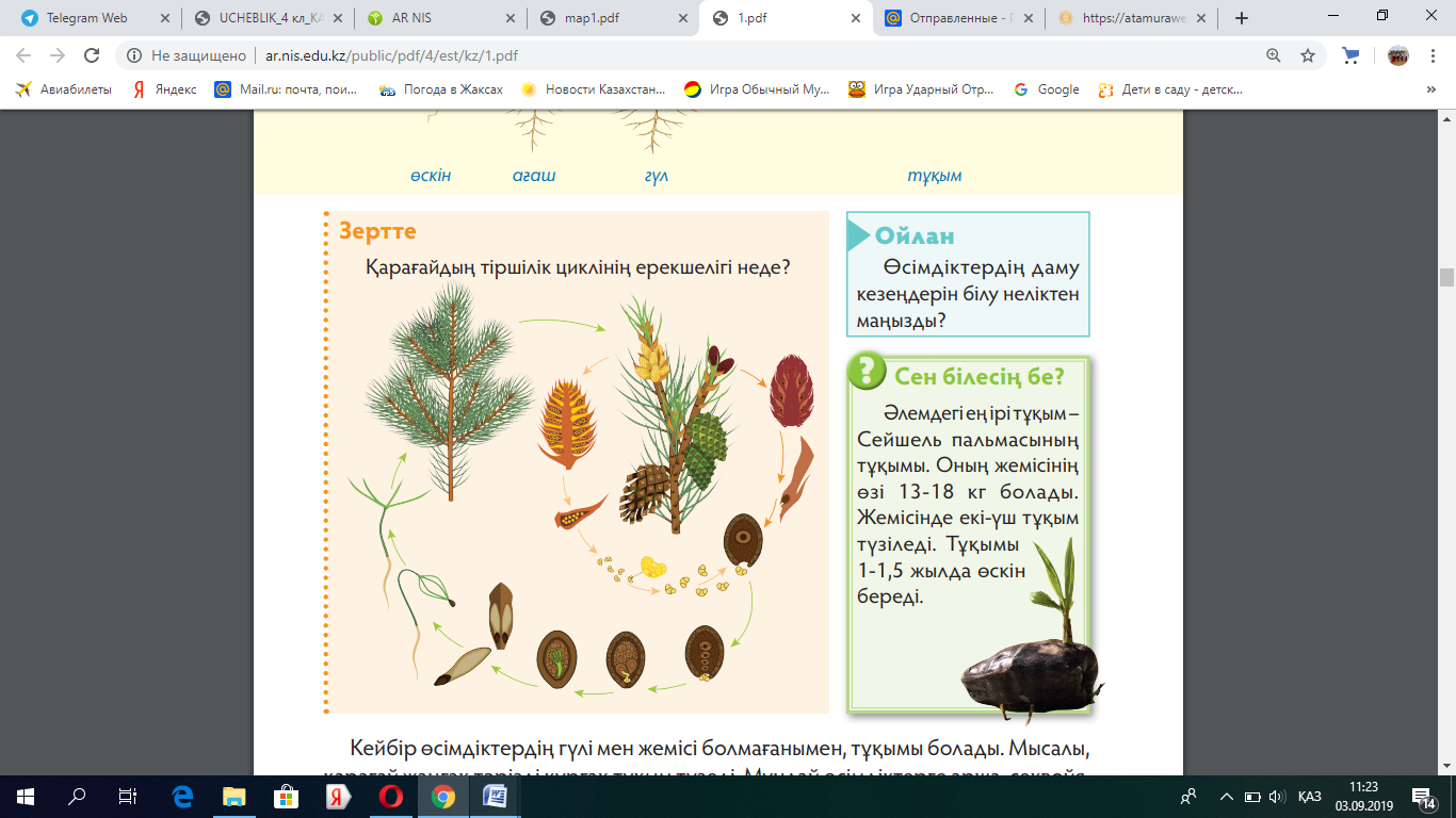 Оқытудың тілдік мақсаты Оқушылар -өсімдіктің тіршілік циклін сипаттайды; -өсімдіктердің таралу жолдарын атайды, сипаттайды; -өсімдіктерді қорғау туралы өз ұсынысын түсіндіріп, әңгімелейді. Пәндік лексика және терминология Тұқым, өскін, ересек өсімдік, солу; Көшет, ересек өсімдік. |