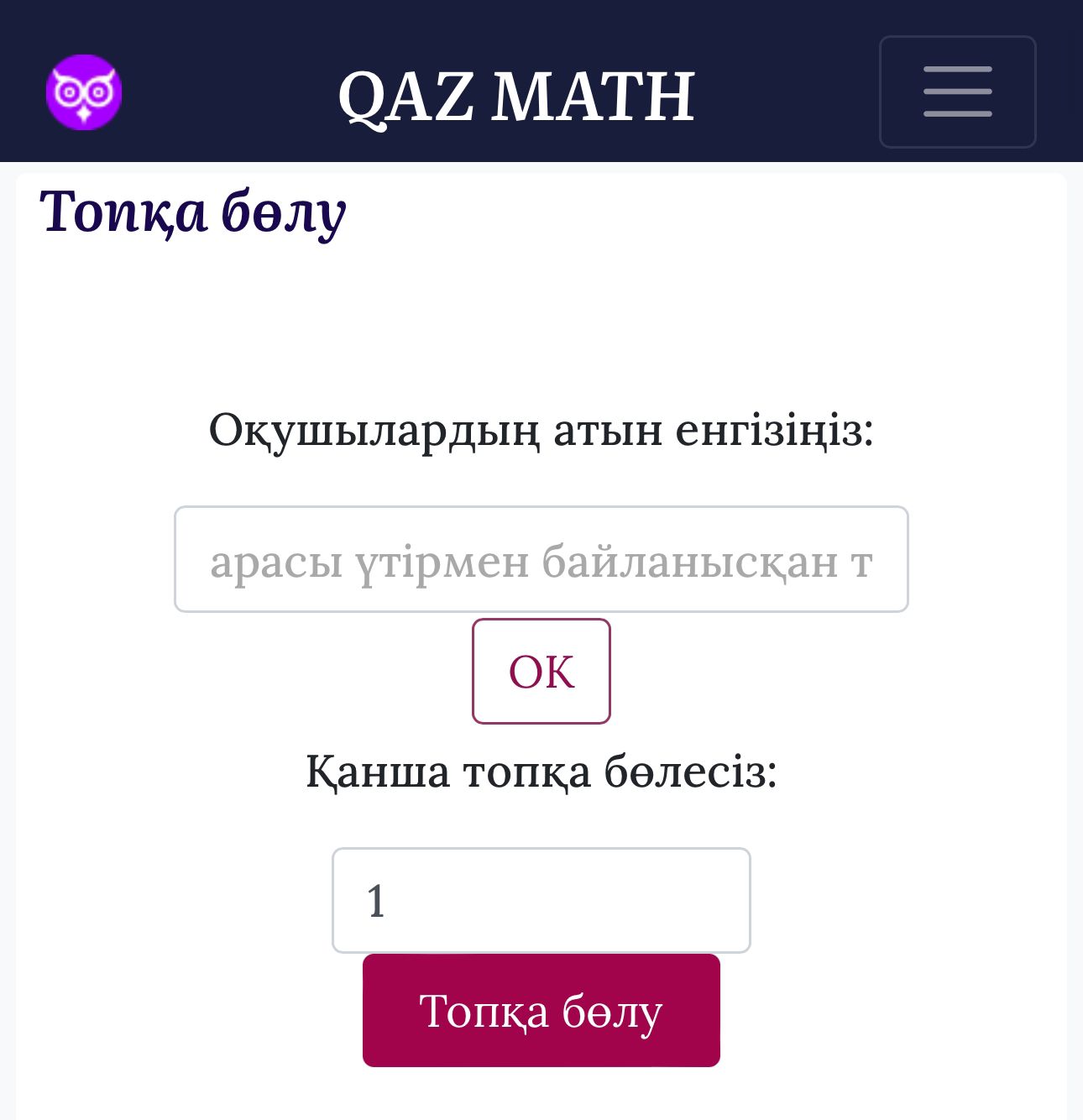 Сәлемдесу Оқушыларды түгелдеу. «Біртұтас тәрбие бағдарламасындағы құндылықтарды процесіне ұйымдастыру кезеңінен бастап,сабақтың әрбір кезеңінде жүргіземін» «Бірлік және ынтымақ ,Еңбекқорлық » құндылығы Жаңа сабақты ашу Топқа бөлу Оқушыларды топқа «QAZMATH» бағдарламасында бөлемін. https://qazmath.net/quraldar/topka-bolu/