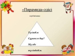 Сыныптағы бағалау оқушылардың жеке, жұпта, топтық жұмыстарына обьективті түрде кері байланыс беру арқылы жүзеге асырылады. Қалыптастырушы бағалау арқылы оқушыларды бағалау. Өзін-өзі бағалау «Бас бармақ» әдісі, «Кері байланыс бутерброды» әдісі, Өзара бағалау «Бір +, бір - » әдісі арқылы жүргізіледі. Сабақ соңындағы «Пирамида» рефлексиясы келесі сабақты жоспарлауға негіз болады. |