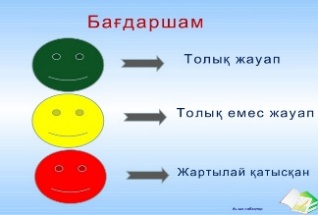 Тапсырмалардағы дескрипторларға сүйеніп, «Бағдаршам» түстері арқылы өзін-өзі бағалау жүргізіледі. Сергіту сәті: «Қолтырауын ойыны»