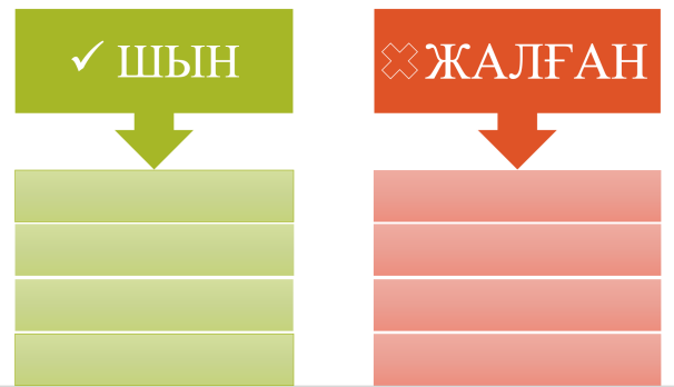 “Шын, жалған” әдісі бойынша мәтінлегі мәліметтерді екі кестеге топтастыру;