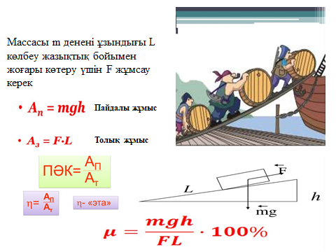 – көлбеу жазықтықтың пайдалы әрекет коэффициентін тәжірибеде анықтайды;