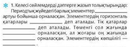Тақырыпты түсініп, берілген анықтамаларды дәптерге жазып алады. Периодтық жүйені қолдана отырып, берілген элементтердің орнын және реттік номерін, атомдық массасын анықтайды. Тақырыпты оқи отырып дәптерге берілген тапсырманы орындайды. Бос орынға тиісті сөзді тауып, сөйлемді толықтырады. Берілген тапсырмаларға жауап бере отырып химиялық құрақ құрайды. Топпен бірігіп берілген тапсырмаларды орындап пирамида құрастырады. Оқулықпен жұмыс жасайды. Берілген тапсырманы орындайды. |