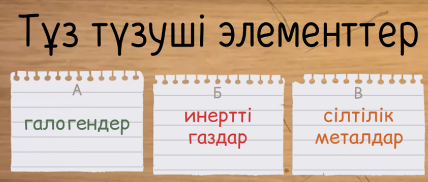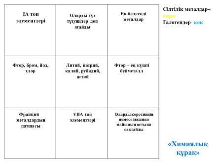 сөз ҚБ: дескрипторы бойынша бірін-бірі бағалайды. Дескрипторы: - галогендерді, сілтілік металдарды анықтайды 1б; - құрақты дұрыс құрастырады 1б Барлығы 2 балл ҚБ: дескриптор бойынша өзін-өзі бағалайды Дескрипторы: - Элементтердің периодын дұрыс анықтайды 1 б - сілтілік металдардың физикалық қасиетін анықтайды 1 б - инертті газдарды, галогендерді анықтайды 1 б Барлығы 3 балл ҚБ: дескрипторы бойынша Дескрипторы: Әр сұрақ