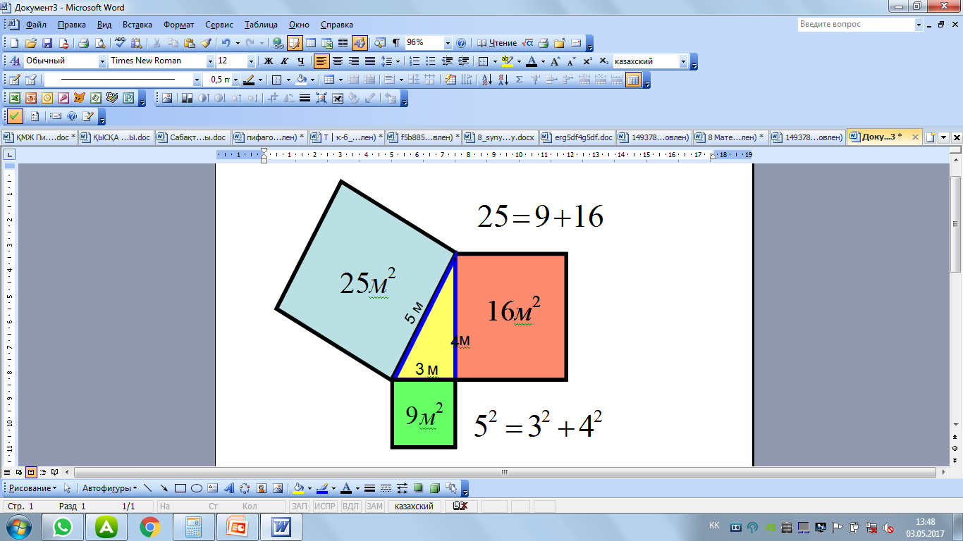 ойыны. - Олар қандай фигуралар? (шаршылар) - Қалай ойлайсыздар, ондағы өлшем нені білдіреді? (аудандарын) - Шаршы аудандарының арасында қандай байланыс бар?(кішілерінің қосындысы үлкеніне тең) - Әрбір екеуінінің тек бірғана ортақ төбесі болатындай етіп орналастыруға бола ма?(уақыт беріледі, оқушылар орналастырады, болады) - Қандай біз білетін жазық фигура пайда болды?(үшбұрыш) - Фигура - үшбұрыштың қай түрі?(тікбұрышты үшбұрыш) - Ол фигураның қандай элементтері шаршылардың қандай элементтерімен қандай байланысы бар?( қабырғалары сәйкес) - Одан қандай қорытындыға келуге болады? (катеттері квадраттарының қосындысы гипотенузаның квадратына тең)