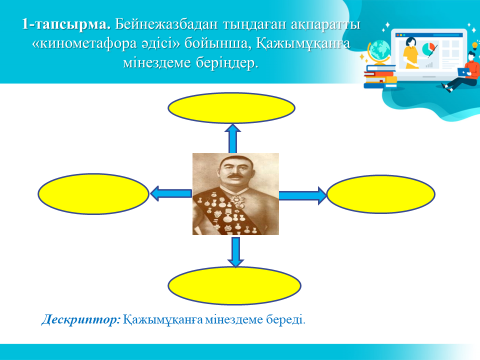 2-тапсырма: Жеке жұмыс.Бейнежазбадан тыңдаған ақпаратты «кинометафора -әдісі» бойынша, Қажымұқанға мінездеме беріңдер.
