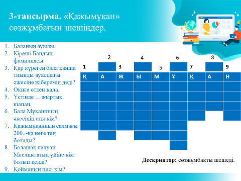 Дескриптор -сөзжұмбақ сұрақтарын шешеді-1 -талдау жасайды-1 -кейіпкерлерге мінездеме береді-1