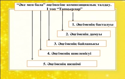 Оқушылар орындай алады: Мәтін мазмұны бойынша бірқатар сұрақтарға жауап беру үшін жеке, жұптық, топтық жұмыс атқарады, шығарма фабуласы мен идеясын анықтайды, сюжеттік құрылымын талдайды. |