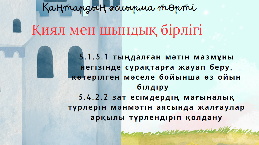 5.1.5.1 тыңдалған мәтін мазмұны негізінде сұрақтарға жауап беру, көтерілген мәселе бойынша өз ойын білдіру 5.4.2.2 зат есімдердің мағыналық түрлерін мәнмәтін аясында жалғаулар арқылы түрлендіріп қолдану |