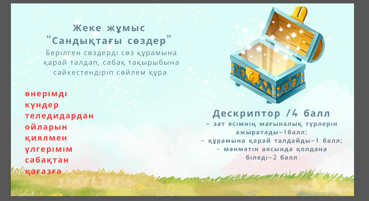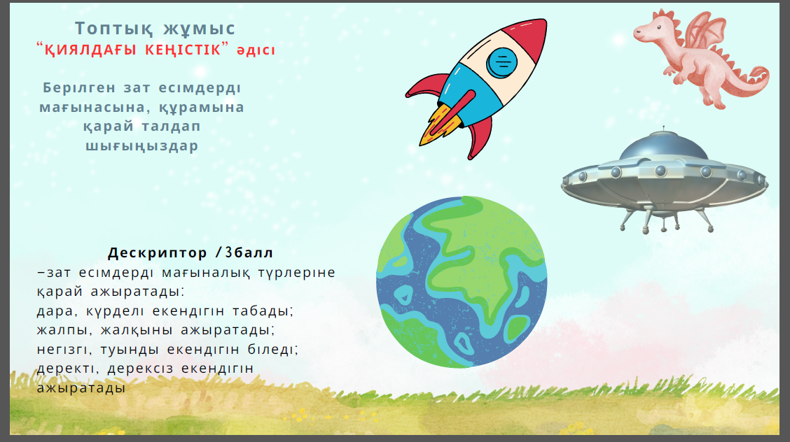 Дескриптор /3балл -зат есімдерді мағыналық түрлеріне қарай ажыратады: дара, күрделі екендігін табады; жалпы, жалқыны ажыратады; негізгі, туынды екендігін біледі; деректі, дерексіз екендігін ажыратады ҚБ Мұғалімнің бағалауы Дескриптор /4 балл - зат есімнің мағыналық түрлерін ажыратады-1балл; - құрамына қарай талдайды-1 балл; - мәнмәтін аясында қолдана біледі-2 балл |