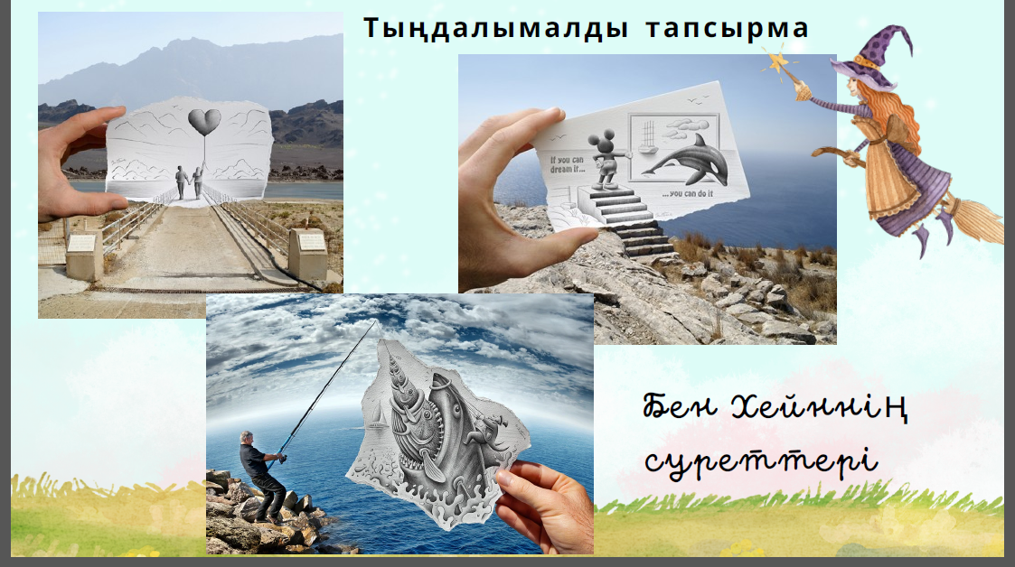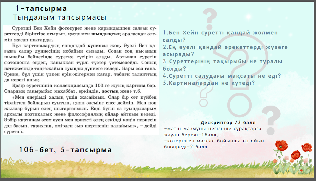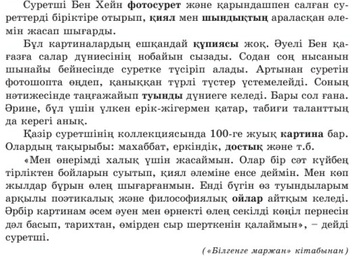 Мәтін мазмұны бойынша сұрақтарға жауап бер 1.Бен Хейн суретті қандай жолмен салды? 2. Ең әуелі қандай әрекеттерді жүзеге асырады? 3.Суреттерінің тақырыбы не туралы болды? 4. Суретті салудағы мақсаты не еді? 5. Ол әр картиналарынан не күтеді? Берілген зат есімдерді мағынасына, құрамына қарай талдап шығады Берілген сөздерді сөз құрамына қарай талдап, сабақ тақырыбына сәйкестендіріп сөйлем құрайды ЕББҚ (қабылдауы баяу оқушы) Көп нүктенің орнына тиісті жұрнақтарды қойып, сөйлемді көшіріп жазып шығады Оқушылар сабаққа қатысты пікірлерімен бөліседі Мүмкіндігіне қарай ментиметр платформасында да оқушылар кері байланыс бере алады. |