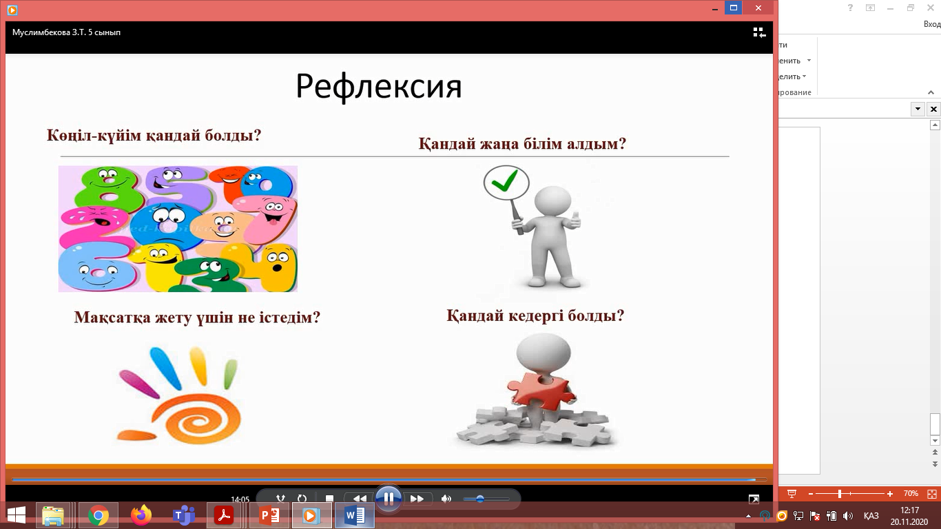 Рефлекция: «Көңіл-күйім қандай болды?», «Қандай жаңа білім алдым?»