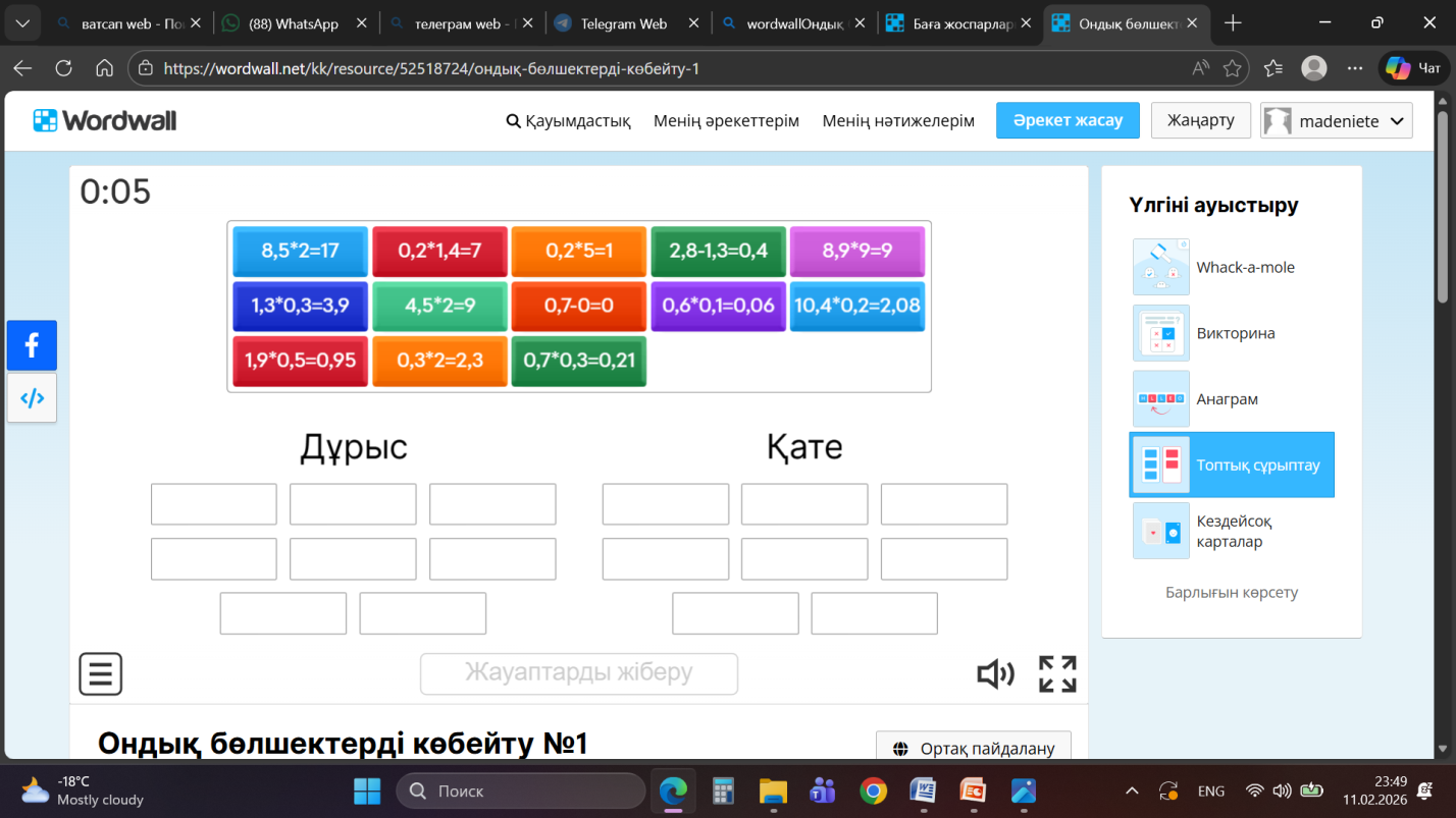 Дескриптор -Ондық бөлшекті ондық бөлшекке көбейтеді -Үтір орнын дұрыс қояды -Ондық бөлшекті натурал санға көбейтеді 3 балл Өз өзі бағалайды |