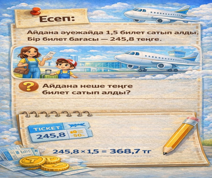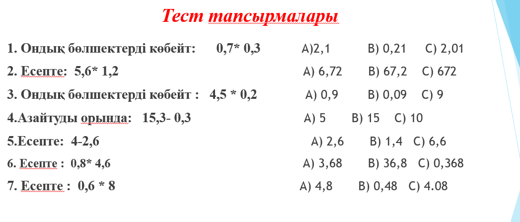 Дескриптор: -Ондық бөлшектермен амалдарды орындайды (қосу/азайту). - Ондық бөлшектерді көбейтеді -Нәтижені жазады 3балл |