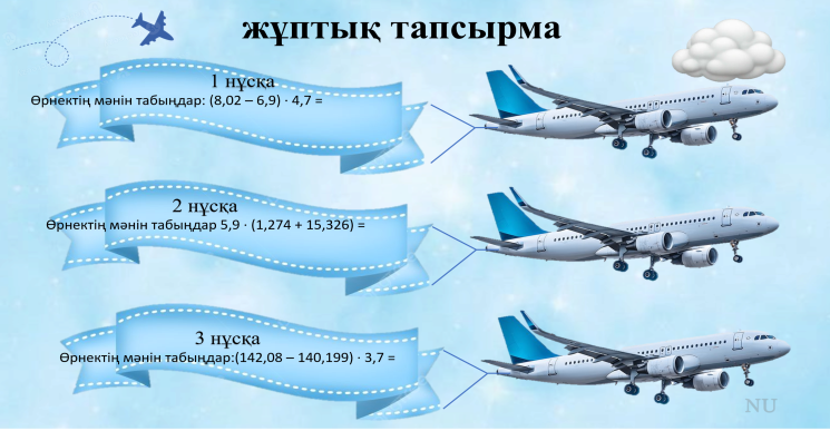 Оқушылар жұптық тапсырманы орындайды. Өрнекті оқып, алдымен жақша ішіндегі амалдарды орындайды. Ондық бөлшектермен есептеулерді дұрыс жүргізіп, көбейтуді орындайды. |