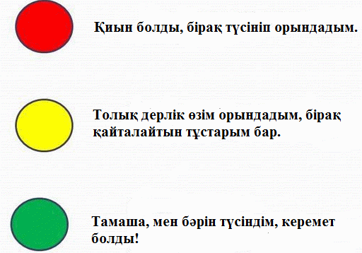 Рефлексия. «Светофор» әдісі (қызыл, сары, жасыл түстер) бойынша әр оқушы өз жұмысына баға береді: