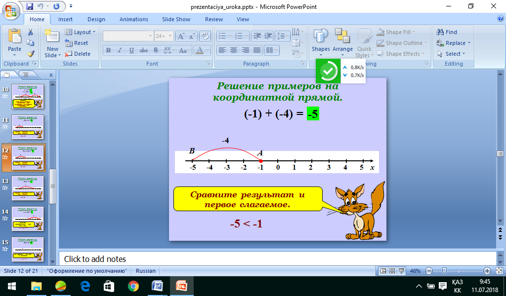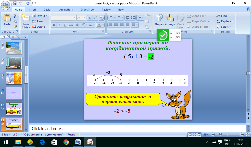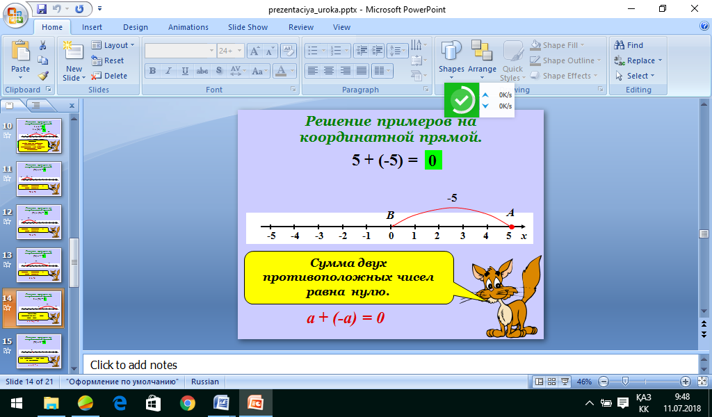 1.1. Белсенді оқу әдісі "Конверттегі сұрақ" Өткен сабақты бекіту мақсатында өткен сабақ бойынша сұрақтар жазылып, конвертке салынады.Оқушылар конверттегі сұрақтарға жауап береді. 1. Қандар сандар рационал сандар жиынын құрайды? 2. Координаталық түзу дегеніміз не? 3. Координаталық түзуде оң сандар қай бағытта кескінделеді? 4. Координаталық түзуде теріс сандар қай бағытта кескінделеді? 5.Қандай сандарды қарама-қарсы сандар деп атаймыз? 6. Термометрді координаталық түзу ретінде пайдалана аламыз ба? Неліктен? Термометрдің оң бағыты қалай қарайды? (Слайд ) Бүгінгі сабақтың мақсаты қандай болады деп ойлайсыздар? (Оқушылар өз ойларын айтады). Оқушылардың жауаптарын қорыта келе сабақ мақсатымен таныстыру. Олай болса бүгінгі сабақтың мақсатына жету үшін сабақтың тапсырмаларын орындайық. 1. Координаталық түзуде санды белгілей алады; 2. Координаталық түзуді пайдаланып сандарды қосу және азайту ережесін біледі және пайдаланады. Сыныппен жұмыс. Оқушыларға «Көбелекті қуалау» ойынын ұсынамыз. Ол үшін әр оқушы өз дәптерінде координаталық түзуді кескіндейді. Мұғалім жүргізушіні таңдайды. Жүргізуші координаталық түзудің қандай нүктесінде «көбелекті» орналастыру керектігін нұсқайды. Жүргізуші амалдарды орындауды ұсынады. Мысалы: (-3) - ті қосыңыз; (2) – ні қосыңыз; (7) - ні қосыңыз; (-10) – қосыңыз; (5) – қосыңыз; (3) – қосыңыз; (-11) – қосыңыз; (14) – қосыңыз; (6) – қосыңыз; (-1) – қосыңыз;