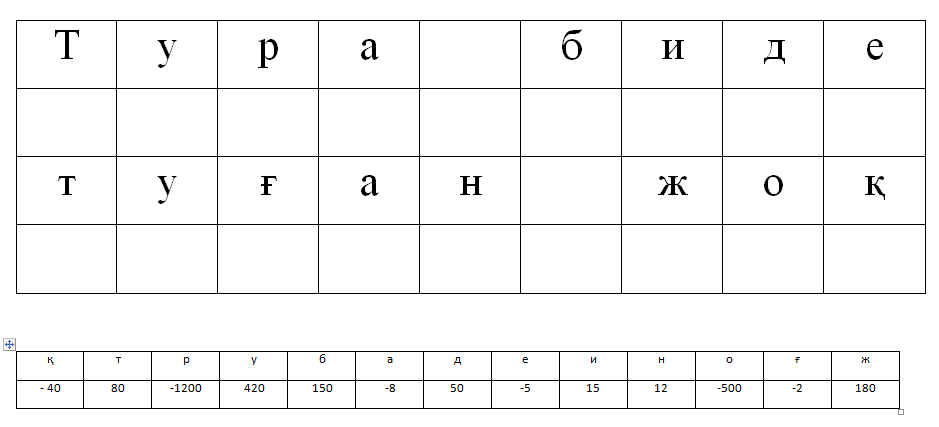 Оқушылар топқа берілген құтыдағы есепті тауып, топпен шығарады. Топпен шығарған есептердің сәйкес әрібін анықтап, тақтадағы әріптің тұсына келіп жазады. «Тура биде туған жоқ» сөзін шығара отырып, апта дәйексөзін талқылауға қатысады. Дескрипторы: