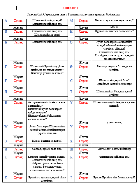 «Комикс не «Сөйле, сурет!» әдісі. 3 топқа шығарма мазмұнына сай суреттер таратылады. Параққа ретімен орналастырып, оқиғаны баяндайды. 3 топқа тапсырмалар беріледі. 1-топқа: «Әңгіме кейіпкерінің сауалнама парағы». Оқушылар кестені толтырады.