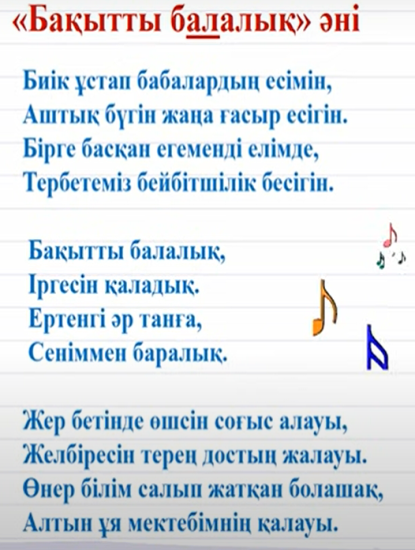 - «Жас дәуірдің түлегіміз» әнін біледі.