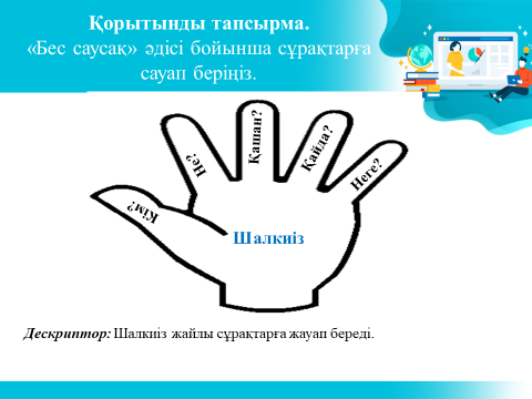 Дескриптор: Шалкиіз жайлы сұрақтарға жауап береді.