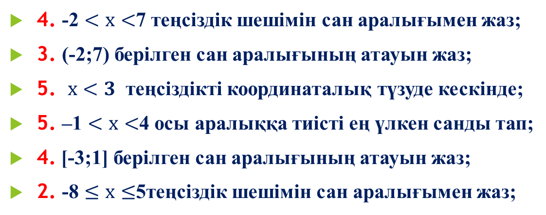 Жалпы -10 балл Дескриптор 1.Аралықтың белгіленуін табады 1б 2.Координата-лық түзуде кескіндейді 1б |