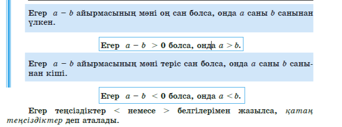 Санды теңсіздіктердің қасиетін біледі және оларды салыстыра алады. Қатаң және қатаң емес теңсіздіктерді ажырата біледі. Мәтін есептерден санды теңсіздік құра алады |