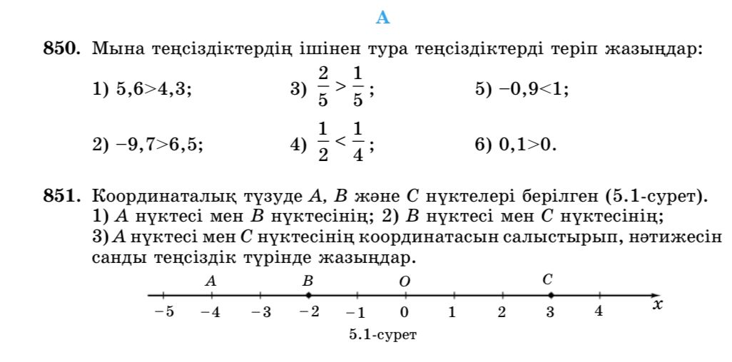 852. Теңсіздік түрінде жазыңдар. Белгісіз шаманы х-пен белгілеңдер: 1. Ыдыстағы сұйықтың көлемі 3 л-ден артық емес; 2. Өзен суының ағыс жылдамдығы 4 км/сағ-тан кем; 3. Бүгін Тараз қаласындағы ауаның температурасы 5°С-тан төмен емес. 4. Доғал бұрыштың градустық өлшемі 90°-тан артық, бірақ 180°-тан кем. |