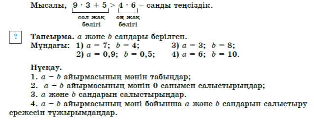 V тарау. БІР АЙНЫ МАЛЫСЫ БАР СЫЗЫ ҚТЫҚ Теңсі здікт ер жә не олардың жү йелері 5.1. Санды теңсіздіктер Есеп. Ұзындығы 7 см, ені 4 см тік төртбұрыштың ауданын қабырғасы 5 см квадраттың ауданымен салыстырыңдар. Салыстыру нәтижесін теңсіздік түрінде жазыңдар. Шешуі. 7 · 4 – тік төртбұрышының ауданы. 52– квадраттың ауданы. 7 · 4 > 52 – санды теңсіздік. Екі санды өрнектің теңсіздік белгісімен («>» немесе «<») жазы- луы санды теңсіздік деп аталады. Теңсіздік белгісінің сол жағындағы жазуды теңсіздіктің сол жақ бөлігі деп, ал оң жағындағы жазуды теңсіздіктің оң жақ бөлігі деп атайды.