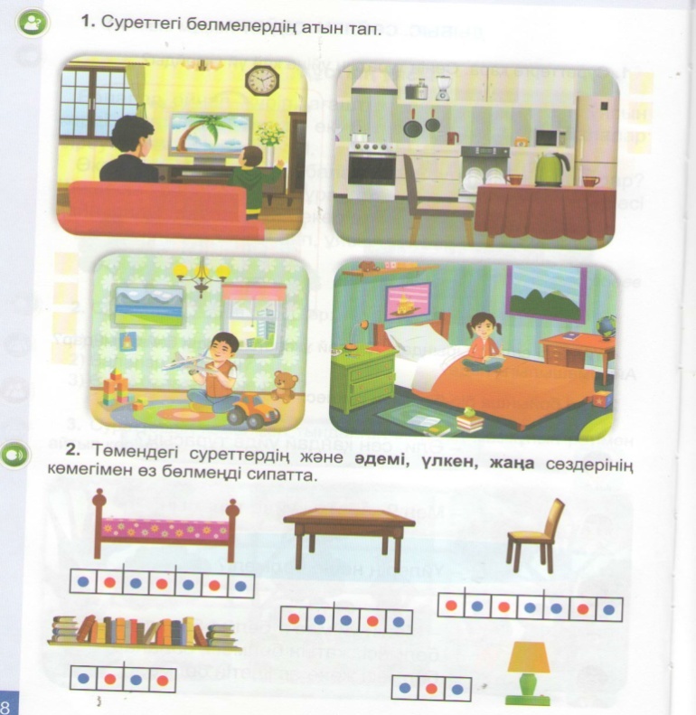 Дескриптор: Білім алушы І Сурет бойынша әңгіме құрай алады ІІ Суретті ажырата алады. ІІІ Көркем сөздерді қолдана алады №2Төмендегі суреттердің және әдемі, үлкен,жаңа сөздерінің көмегімен өз бөлмеңді сипатта.