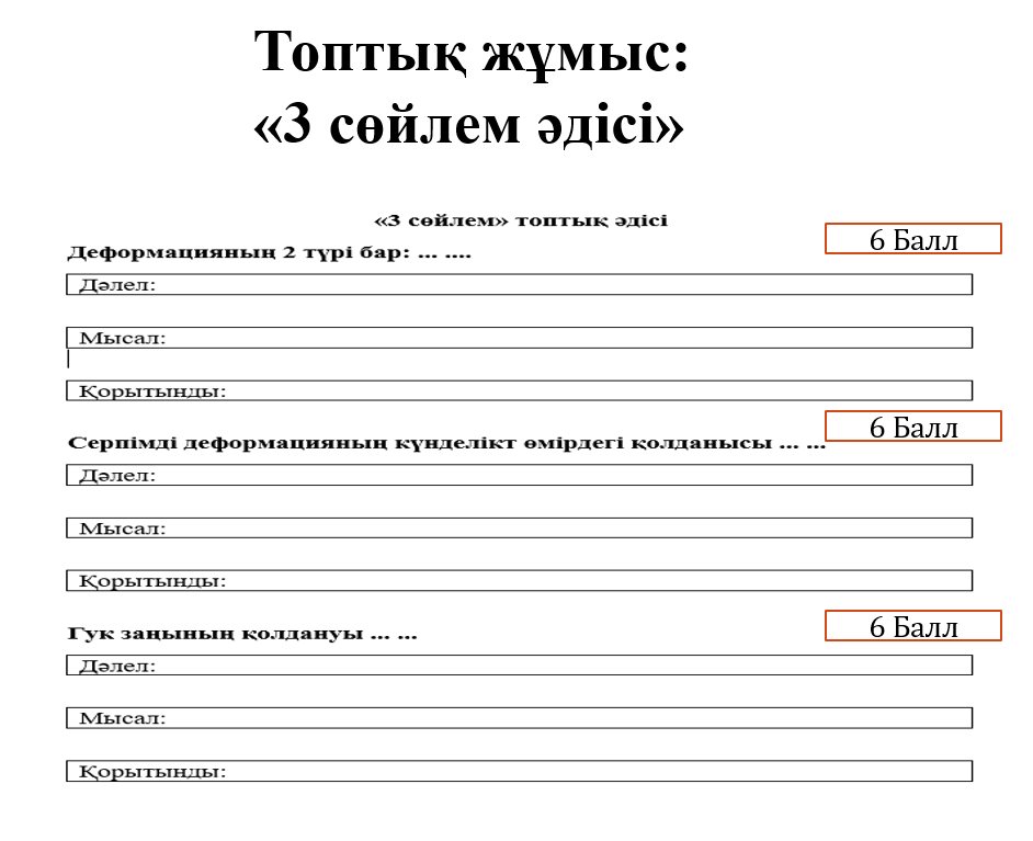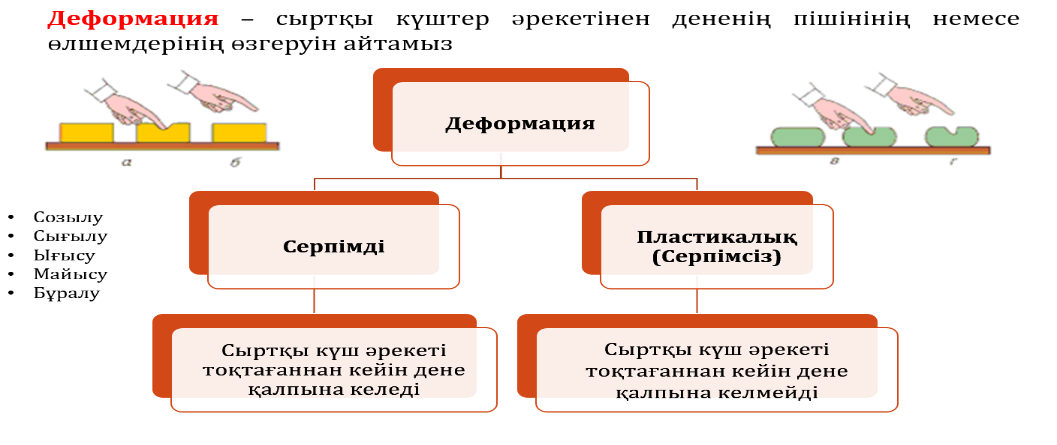 Ойша эксперимент Жұқа тақтай екі блоктың үстіне қойылды. Егер осы конструкцияның үстіне ауыр денені қойсақ не байқалады? Тақтай дененің ауырлық күші әрекетінен майысады, яғни деформацияланады Оқушыларға деформация ұғымын түсіндіріп, оның түрлері туралы айтылады.