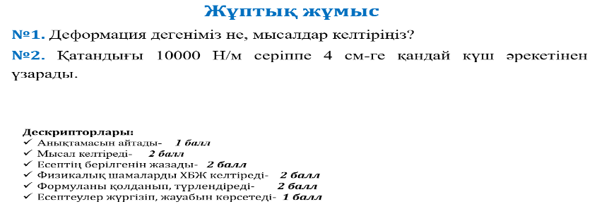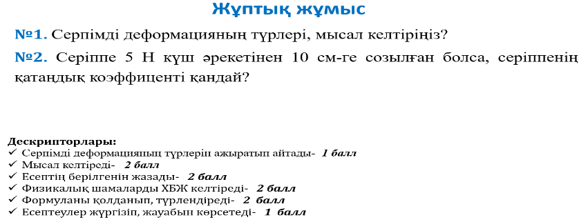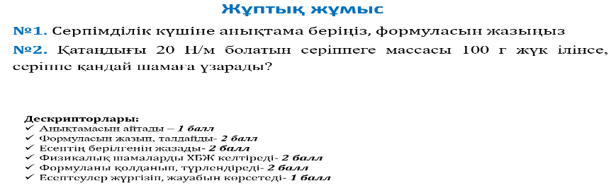 7.2.2.11 - Пластикалық және серпімді дефморацияларды ажыратады, мысалдар келтіре алады; 7.2.2.12 - Гук заңының F = - k∆x формуласы бойынша серпімділік күшін есептер шығарады; |