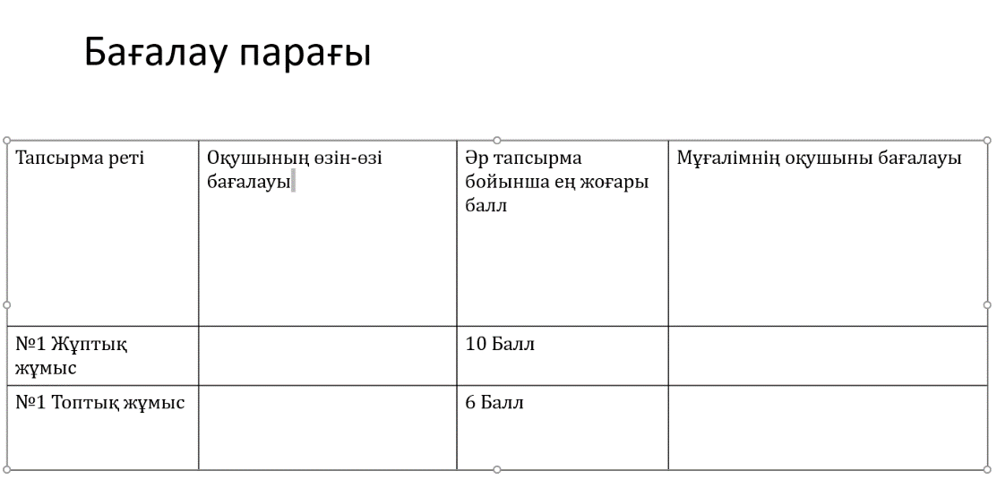Өз жұмысыңызға баға беріңіз Бағалау парағын мұғалімге тапсырады