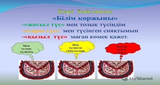 Бүгінгі сабақтағы өзінің әрекеті туралы, жаңа білімді меңгерудегі өзінің жетістіктері мен қиыншылығы туралы ой бөліседі. өзін бағалайды. Топты бағалау |