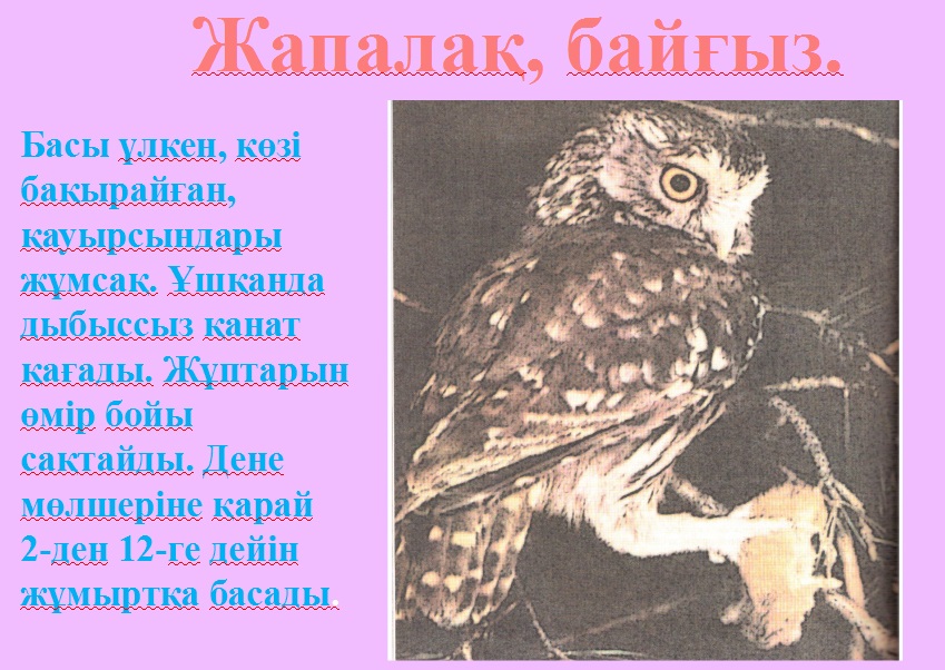 Дескриптор: Сөйлемдерді көшіріп жазады Көркем жазу емлесін сақтап жазады Дескриптор: Құстар туралы біледі, қолданады Құстарға қамқорлық жасау керектігін түсінеді