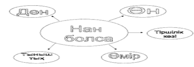 Өлеңді оқып, қимылдар жасайды Өткенді пысықтайды Өлеңді хормен оқиды Автормен танысады Жаңа тақырыппен танысады Жұптаса отырып, берілген тақырыпты біреуі дауыстап оқиды, екіншісі тыңдай отырып, ой түйеді. Жаңылтпаш ты жатқа айтады Нан туралы айтады Топтастыру жасайды Жаттығу жасайды Ребус шешеді Саралау тапсырмасын орындайды Кері байланыс жасайды |