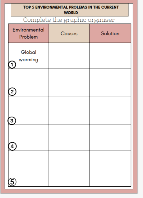 *Watch the video attentively. *Students work in group *Fill in the graphic organizer. Students read the answer from the organizer Answers: 1-Global warming, deforestation, acid rain, urban sprawl, and climate change. 2- Global Warming Cause: Burning fossil fuels, deforestation, and industrial emissions lead to an increase in greenhouse gases, raising atmospheric temperatures. 3- Deforestation Cause: Trees are cut down to clear land for residential, industrial, or commercial purposes, reducing forest cover. 4-Acid Rain Cause: Pollutants from burning fossil fuels, volcanic eruptions, and decaying vegetation release harmful gases into the atmosphere. 5- Climate Change is cause by an increase in atmospheric temperature caused by greenhouse gas emissions from human activities, such as burning fossil fuels and industrial processes. 6Urban Sprawl is cause by Population migration from high-density urban areas to low-density rural areas leads to land degradation and other environmental challenges. |