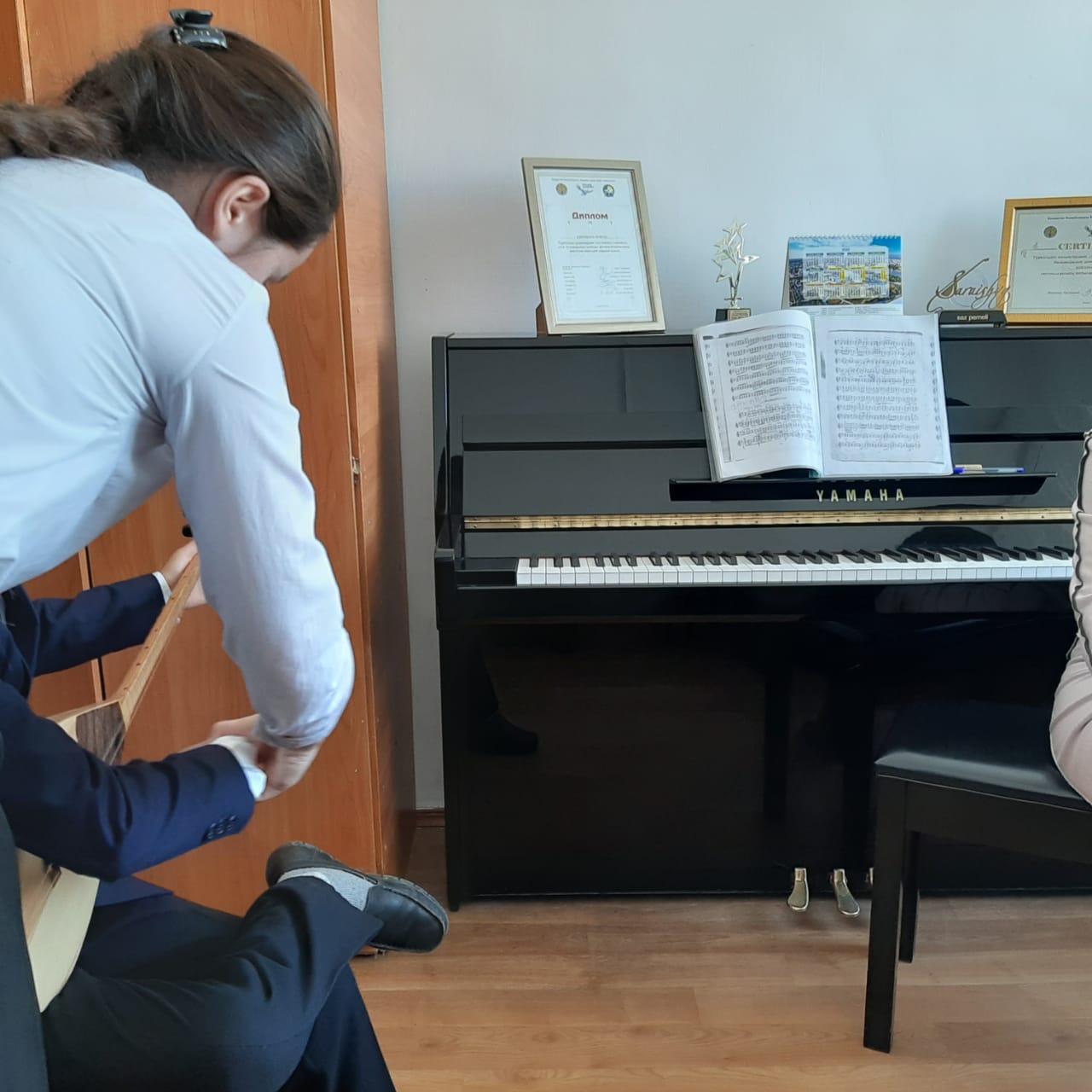 Студент – практиканттың сол қол саусақтарының перне басудағы қателіктерін жөндеп түсіндіруде.